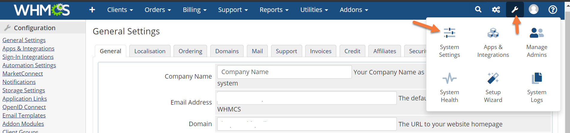 Step 1) First, log in to your WHMCS Admin. Once logged in, click the wrench in the top right corner, then click System Settings.