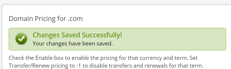 First, tick the check box beneath the Enable column in order to allow customers to register a domain for that period of time.