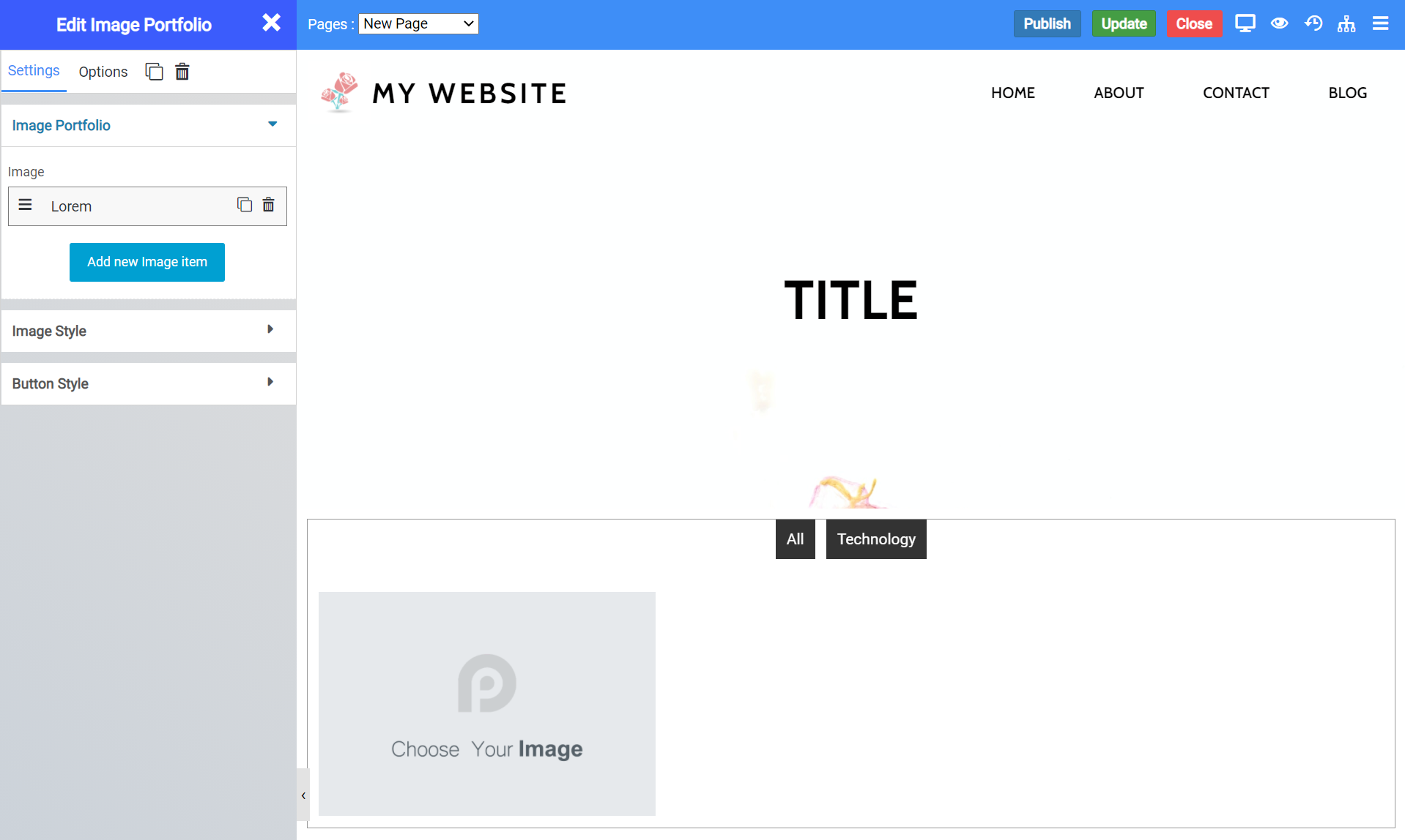 - Beneath Image portfolio, you have the option to add new images. By clicking Add New Image Item, you can add new items to the portfolio grid.