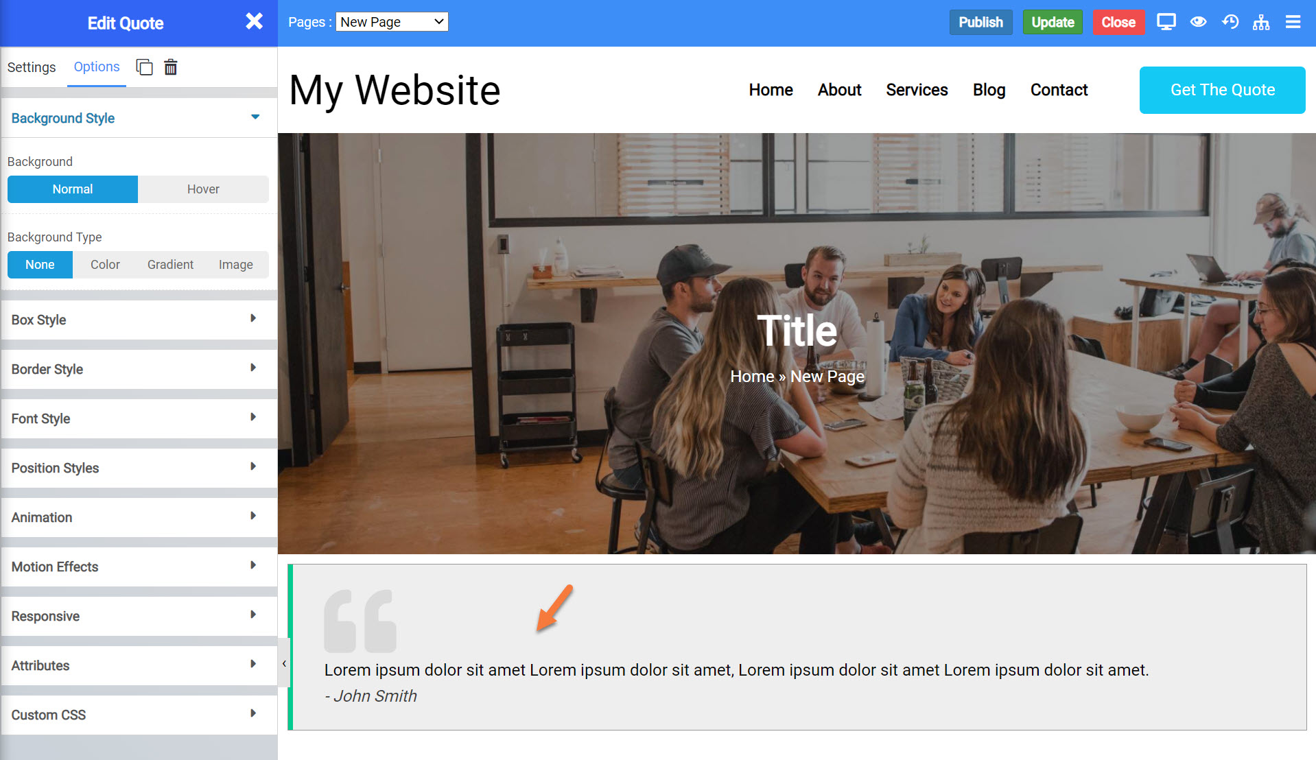 - At the top of the Editor is the Quote section where you can enter the text of your quote. You can do this on the page as well, if you prefer.
