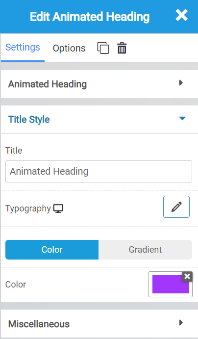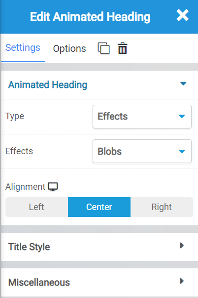 The Miscellaneous setting allows you to adjust settings related to the effect. In the image above, you can see I have the ability to choose the colors of the blobs that are animated onto the heading. This is because I have Blobs as the chosen effect.