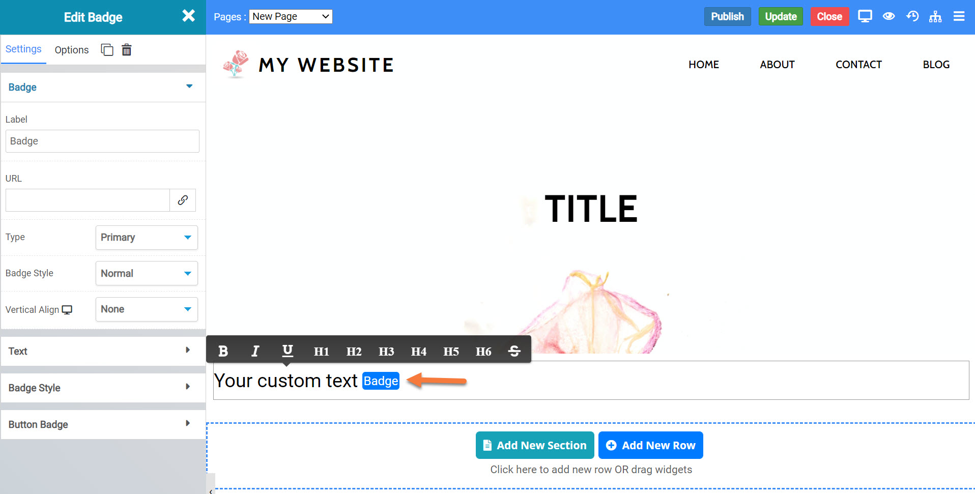 The Badge widget allows you to add a colored label adjacent to title text. This can be used for sorting content, or adding warning or notation tags (badges) to certain texts.