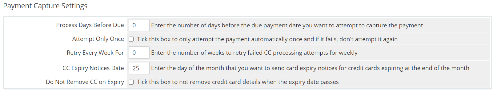 Payment Capture Settings control how automatic payments using stored payment methods are handled.