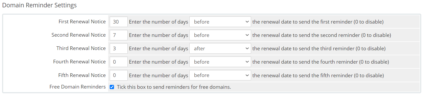 In Domain Reminder settings, you can control when and how many domain reminders are sent.