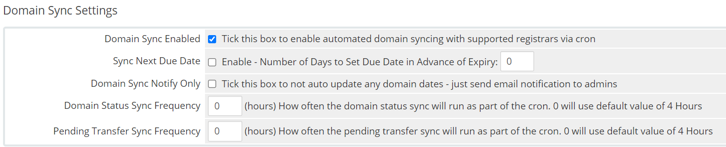 The domain sync settings control whether the domain sync function is used. This ensures the expiration date, next due date, and status of active or pending domains remain accurate. Here you can choose whether you want to enable this function, control how often it syncs, choose whether or not to update the next due date, and whether automatic changes are made and an email is sent to the admin.