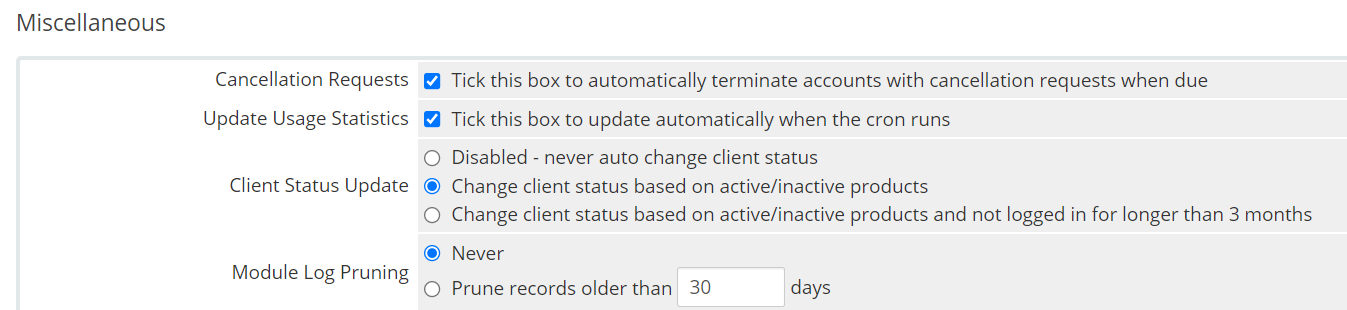 In the Miscellaneous area, you can enable auto-cancellation terminations, automatic usage calculation, and choose how client status updates are handled.