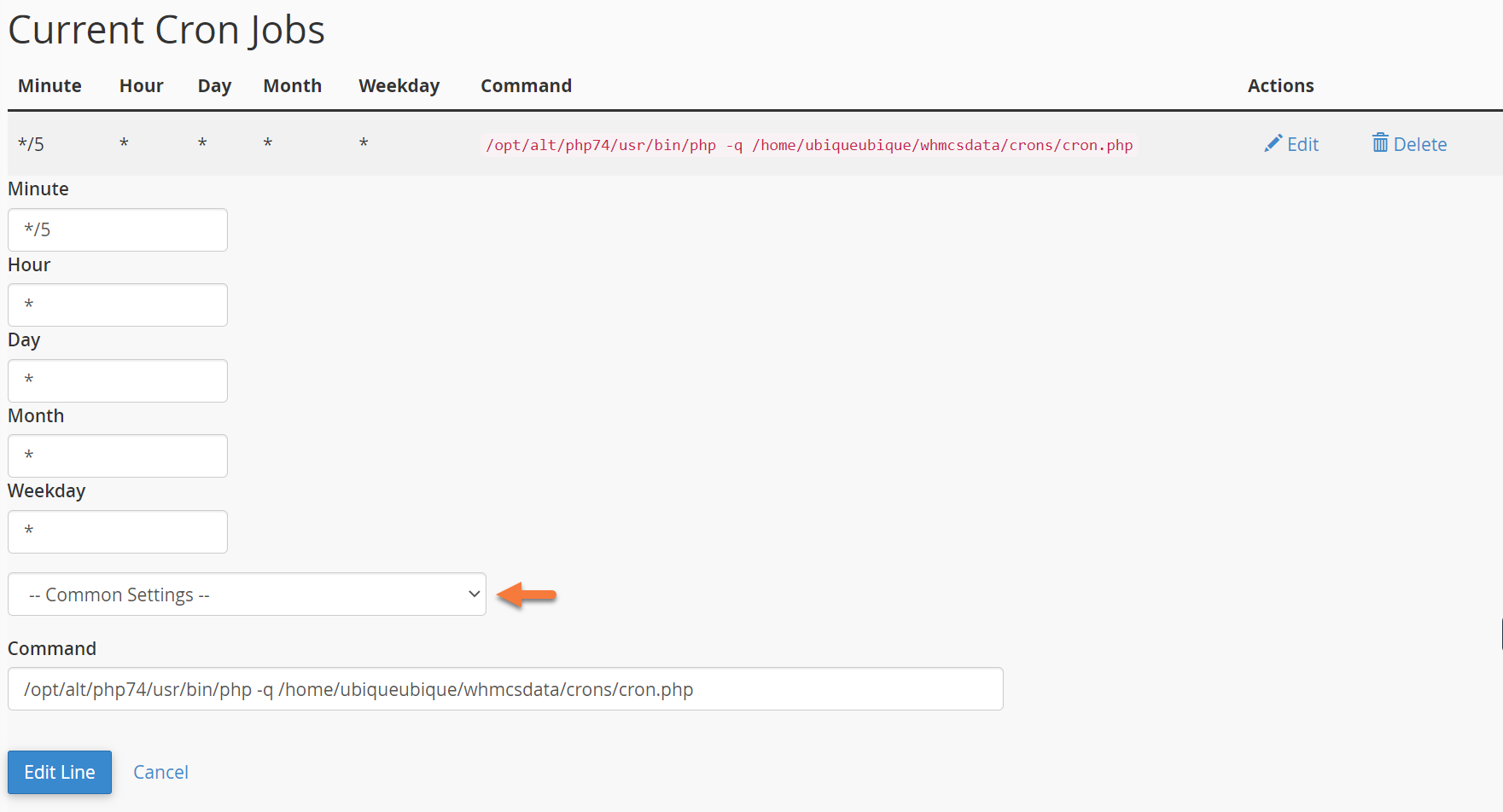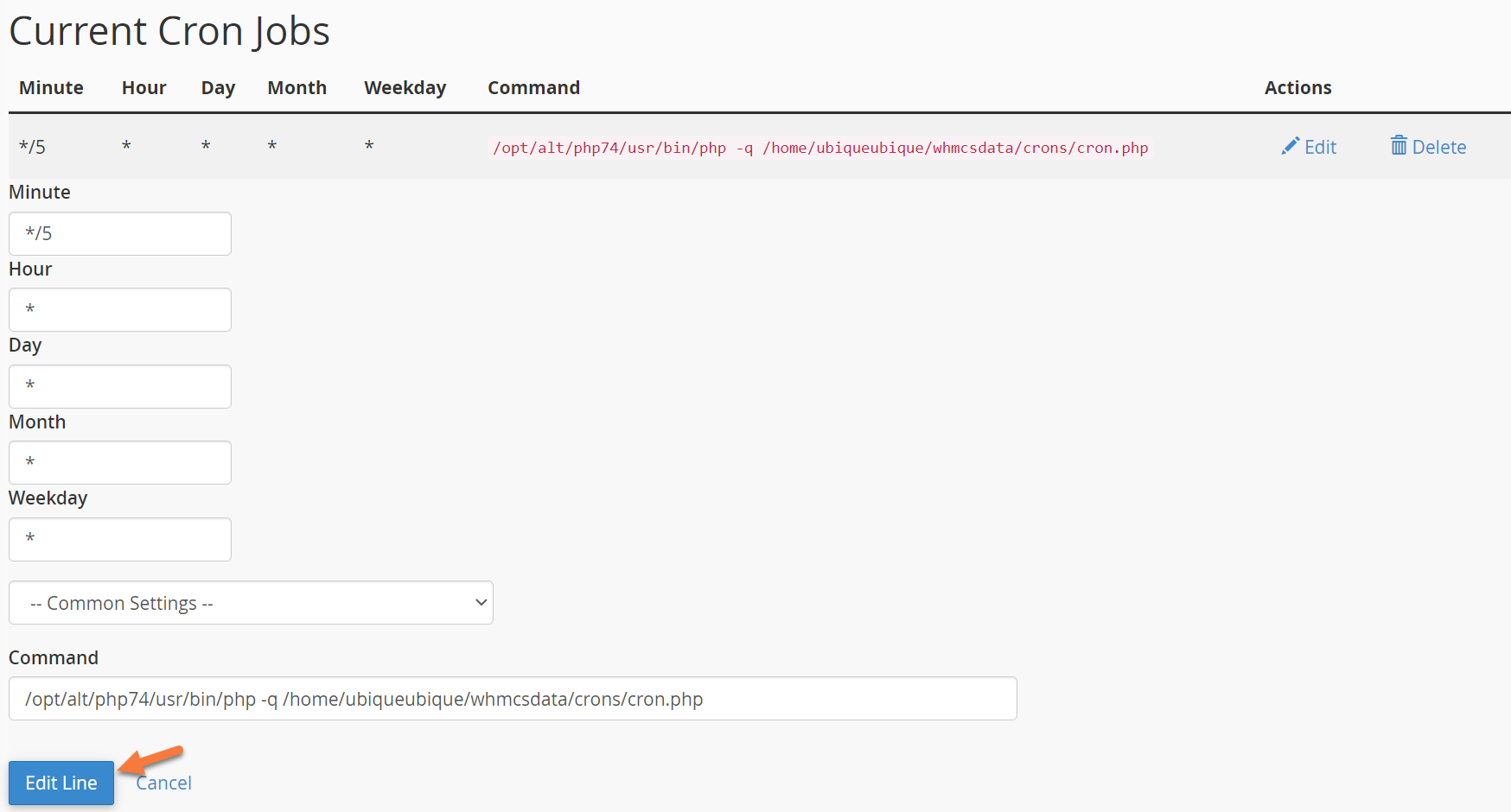 Step 2: When the Cron Jobs page opens, scroll down to the “Current Cron Jobs” section and locate your WHMCS Cron: