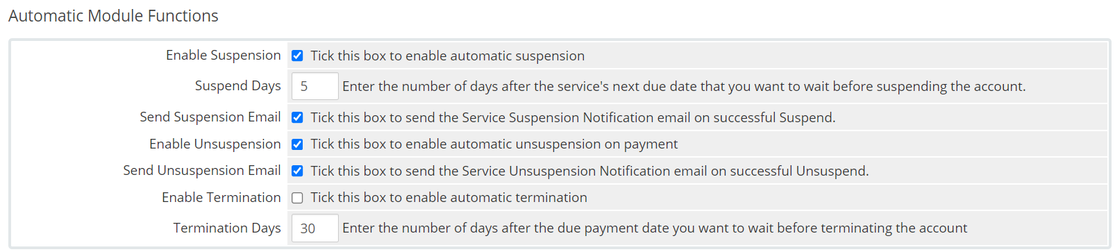 The automatic modules area controls how WHMCS handles suspensions, un-suspension, and terminations. In this section, you can choose whether whmcs performs these functions and the requirements for doing so, such as how overdue a service needs to be before it’s suspended or terminated.