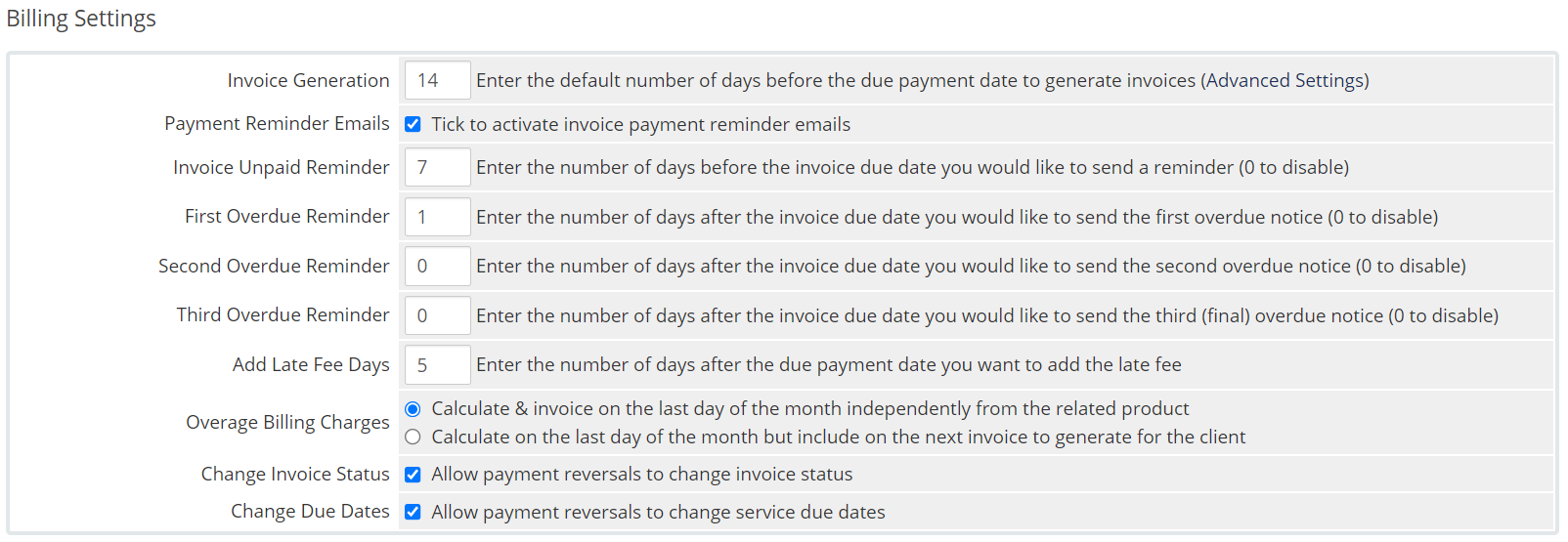 The Billing Settings area lets you choose when invoices, reminders, and overdue notices are sent. You can also adjust when late fees are generated, overage billing calculation, and enable or disable automatic invoice status and due date adjustments if chargebacks occur.