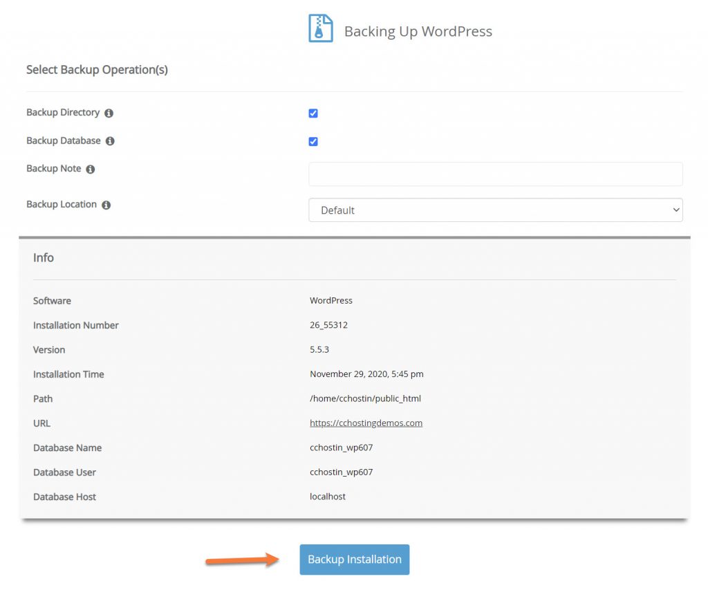 For the most part, the other settings do not need to be configured. To create your backup, just click the blue Backup Installation button.