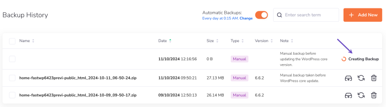 Step 4) In your Backups history, you’ll see a list of backups showing the date each was generated and whether it’s an automatic or manual backup.