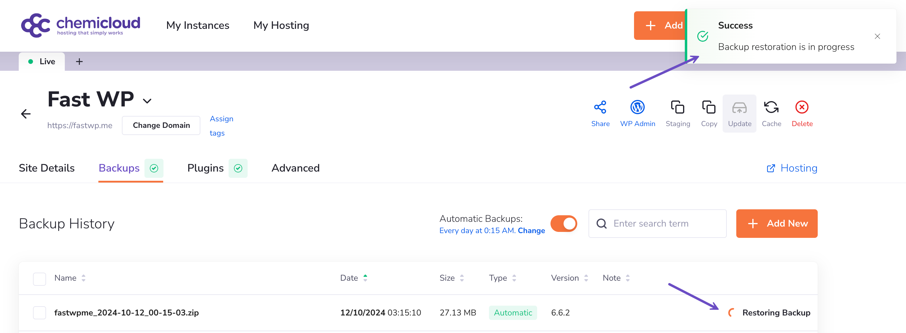 You will receive a confirmation message indicating that the restore is in progress. You can monitor the progress in the Backups section: