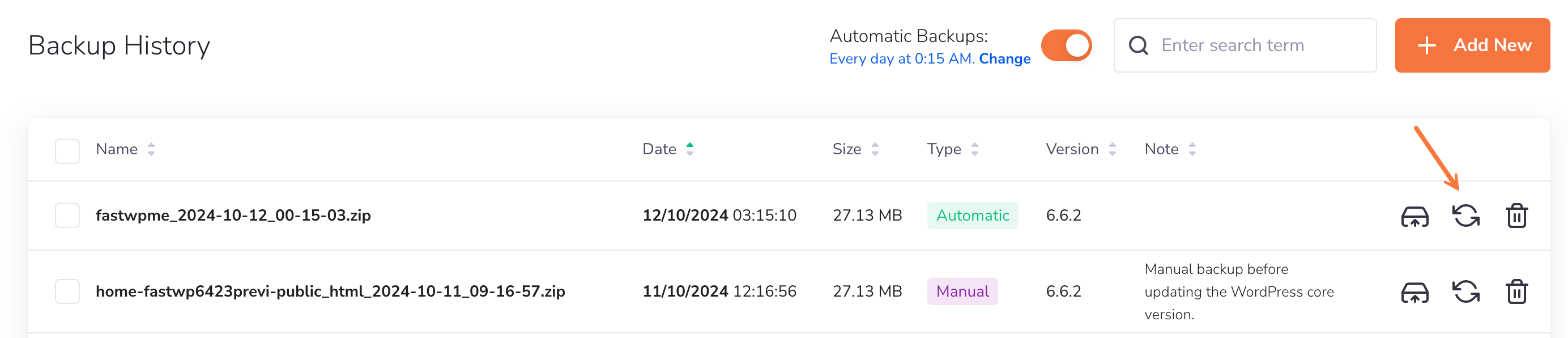 Step 4) In your Backups history, you’ll see a list of backups showing the date each was generated and whether it’s an automatic or manual backup. To restore a backup, click on the “Restore Backup” button next to the backup you wish to restore.