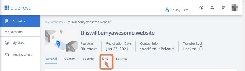 Step 3: When the domain management screen opens, click the DNS tab to open the DNS settings.