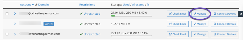 3. Assuming you have already created one or more Email accounts, you should be able to see a list in the section shown below. On the right side of each account, click on the Manage button.