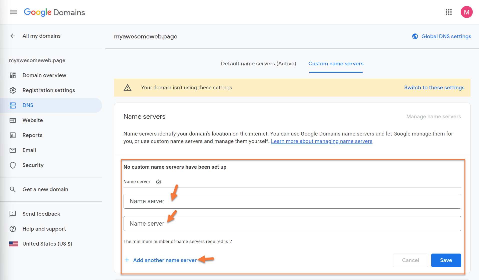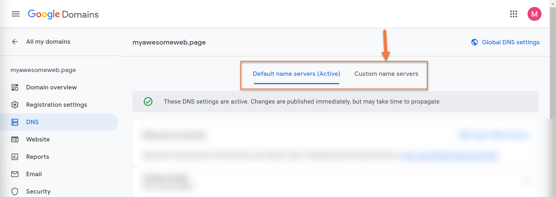 Step 4: Once the DNS Management page loads, look at the top of the page and you will see two options. Click “Custom Name Servers”.