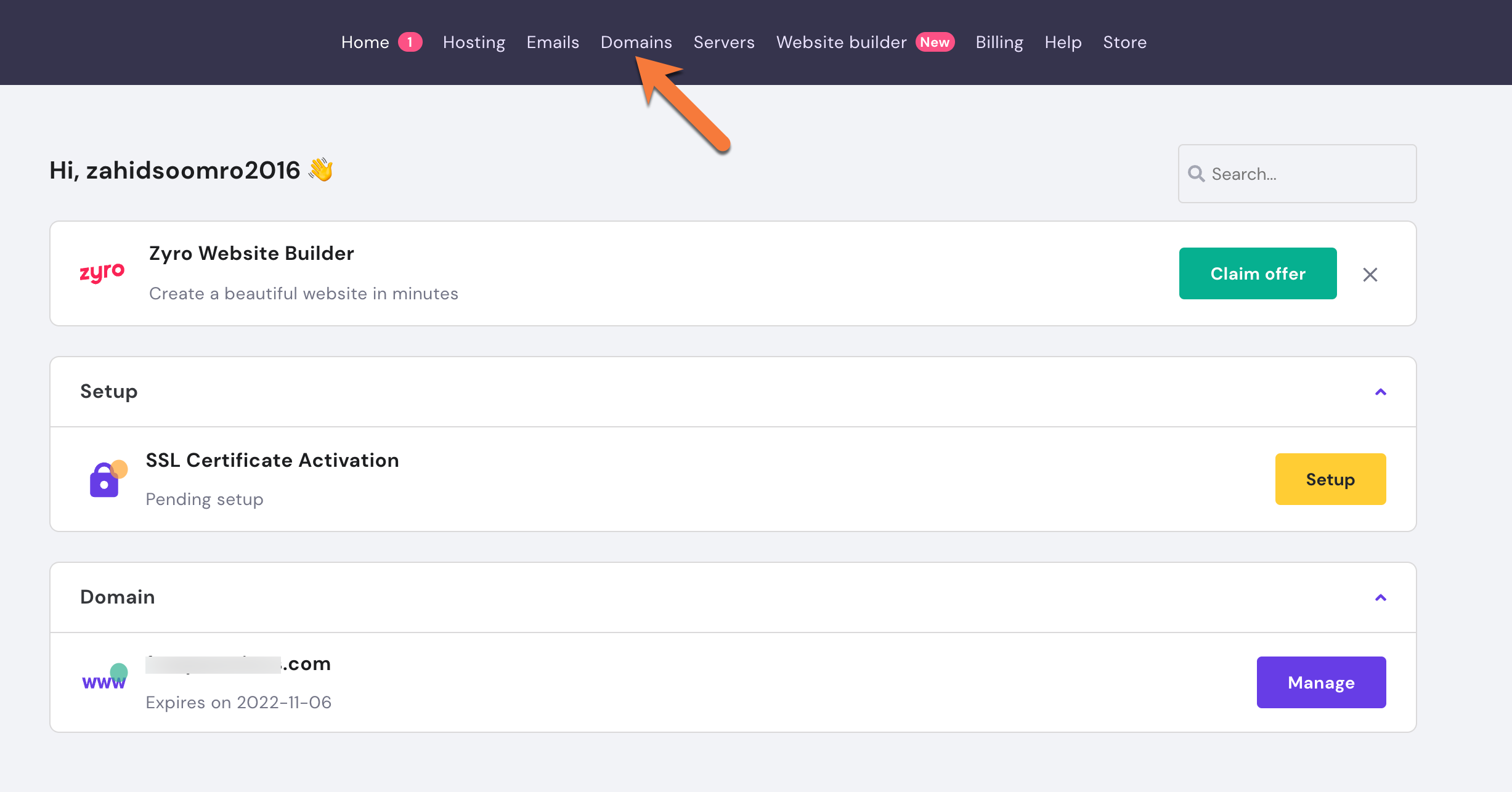 Step 2: After signing into your Hostinger Account, click on Domains from the top menu.