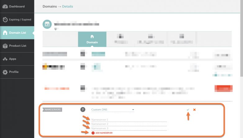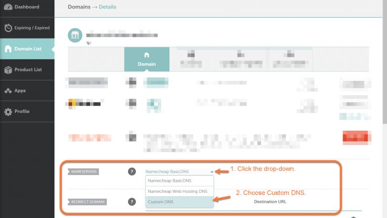 Step 4) When the Domain Details page loads, examine the page for the NAMESERVERS dropdown menu. Click the menu and choose Custom DNS.