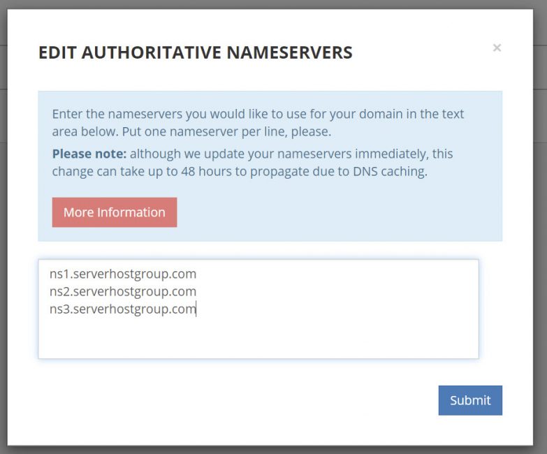 The editor will accept one nameserver per line. When completed, the text box should look similar to the one in the image below: