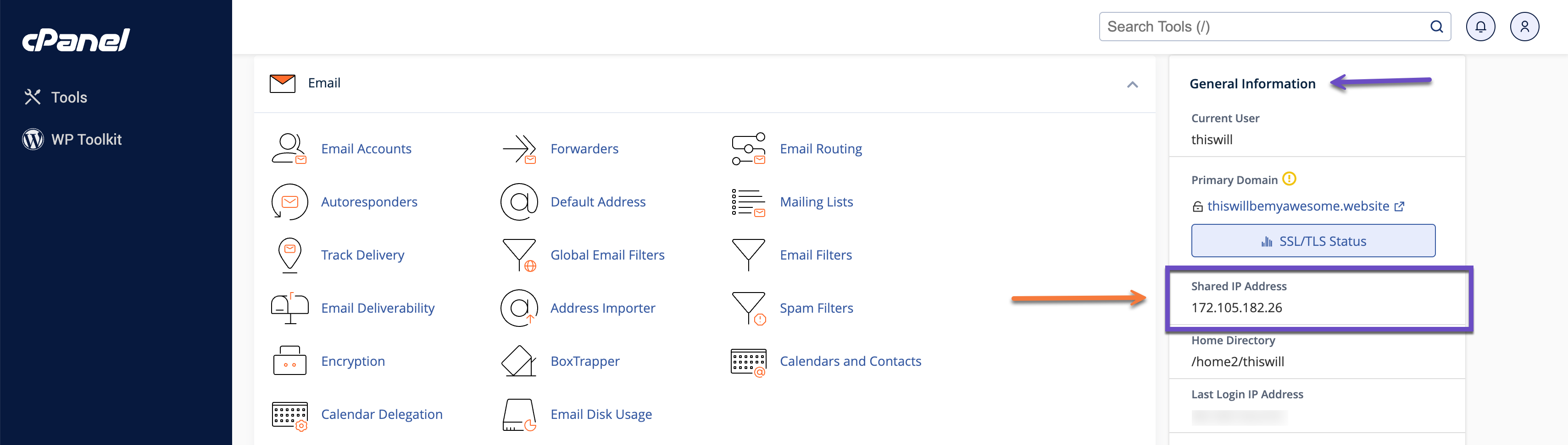 Alternatively, you can quickly find your server’s IP address by logging into cPanel, then look under General Information on the right-hand side for ‘Shared IP address’.