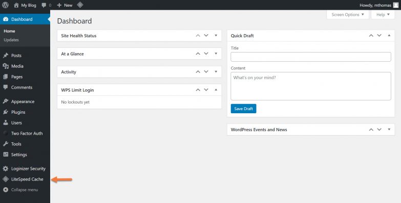 Step 1: Log in to the /wp-admin Dashboard of your WordPress site. After logging in, click the LiteSpeed Cache option in the menu on the left.