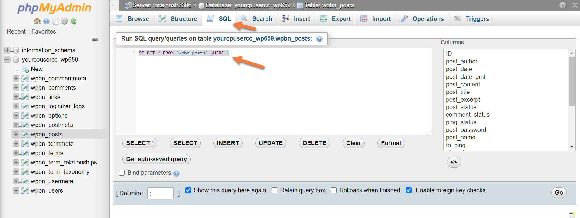 Your phpMyAdmin will open the _posts table. You can tell you have your posts table open because at the top of phpMyAdmin, it will indicate to you the Database and Table you’re presently using: