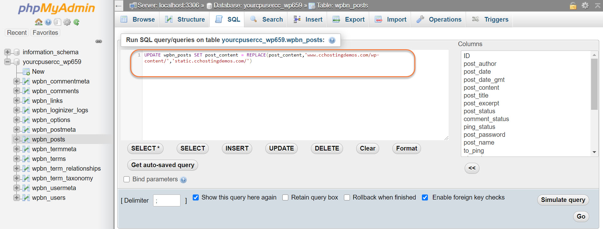 After pasting your query into the box (modified with your table prefix and domain name) you can simulate the query by clicking the Simulate Query button in the bottom right. This will present to you simulated results to ensure the query runs without issue. Or, if you’re ready to execute the command, just click Go.
