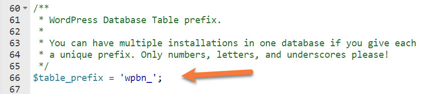 Next, return to the browser tab in which the File Editor is open with the wp-config file still open. Look midway (approximately) through the file for a section called * WordPress Database Table prefix” and note the table prefix that is listed in the line below. In my example, the table prefix is as follows: