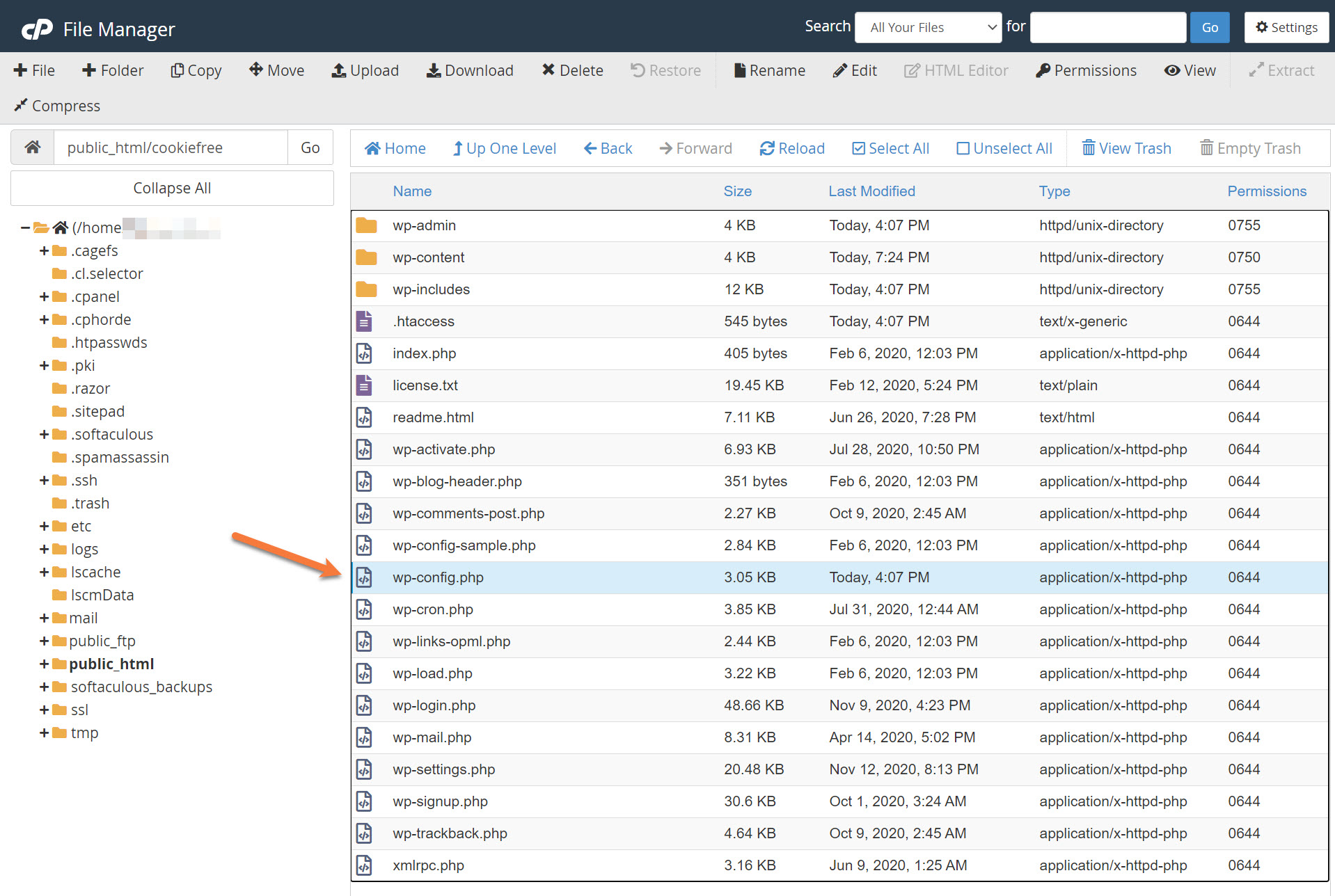 Once you have reached the folder in which your WordPress installation resides, look for the wp-config.php file and click it once to highlight/select the file.