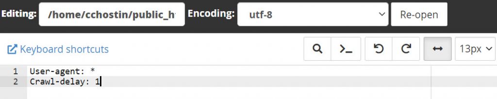 To insert a crawl-delay, copy the text below and paste it into the editor: