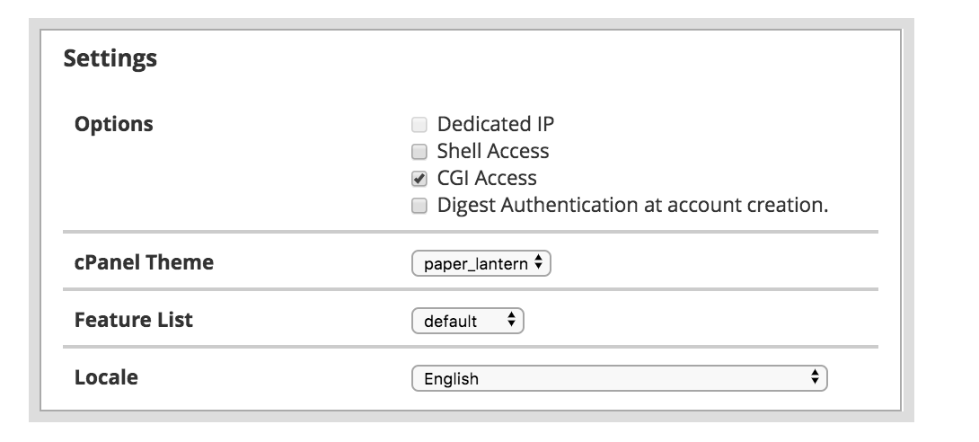 5) Under the Settings section choose the extra cPanel features that the account will have access to.