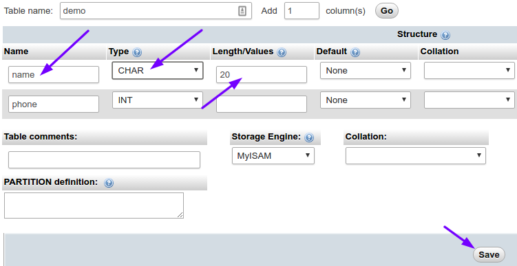 3) We’ve created the table “demo” and added two columns (name and phone), now we need to set the details of each field within this new table and select Type of data the column will hold. Some of the most common types are:
