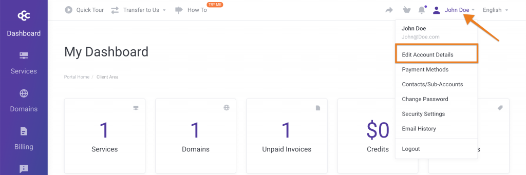 In order to do so, please log into your client area then click on the Edit Account Details submenu.