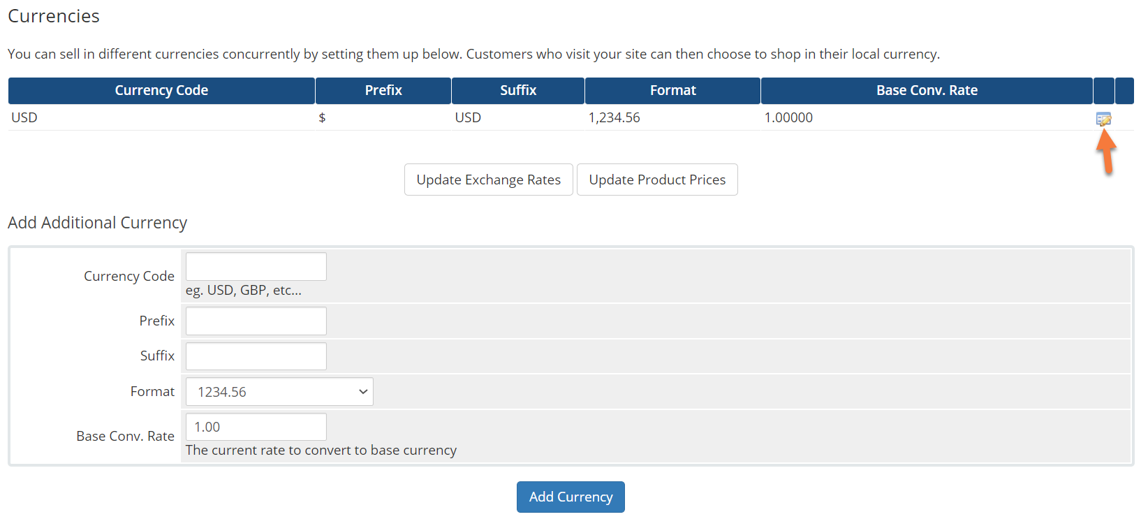 On all WHMCS installations, the default currency is USD. To change the default currency to another currency, click the Edit button.