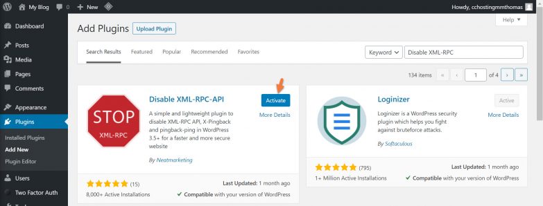 Step 2: Use the search box in the top right corner and search for “Disable XML-RPC” (without the quotes). Find the Disable XML-RPC-API plugin by Neatmarketing and click the Install Now button in the search results.