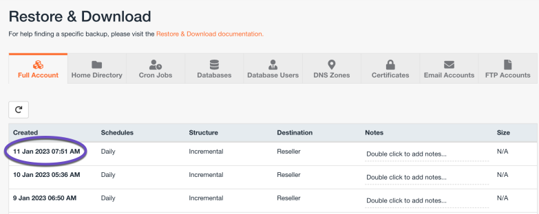 Step 4: The Full account backup restore option will open. Choose the backup date you want to restore by clicking on it, then scroll down the page and click on the Download button.