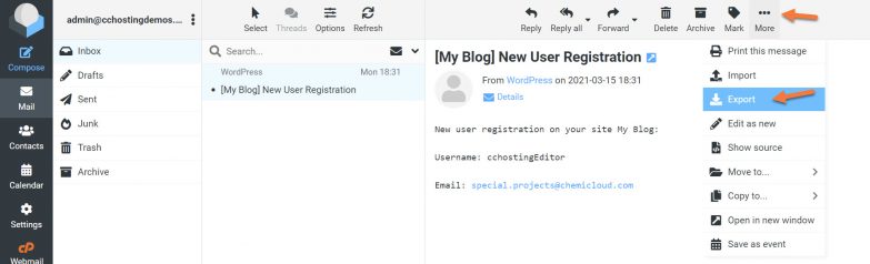 From time to time, our Support team may ask you to export an email message and send it to us for analysis, or you may need to download it for offline storage. Either way, this Knowledge Base article will instruct you on how to export emails in webmail using Roundcube so you can save them to your computer.