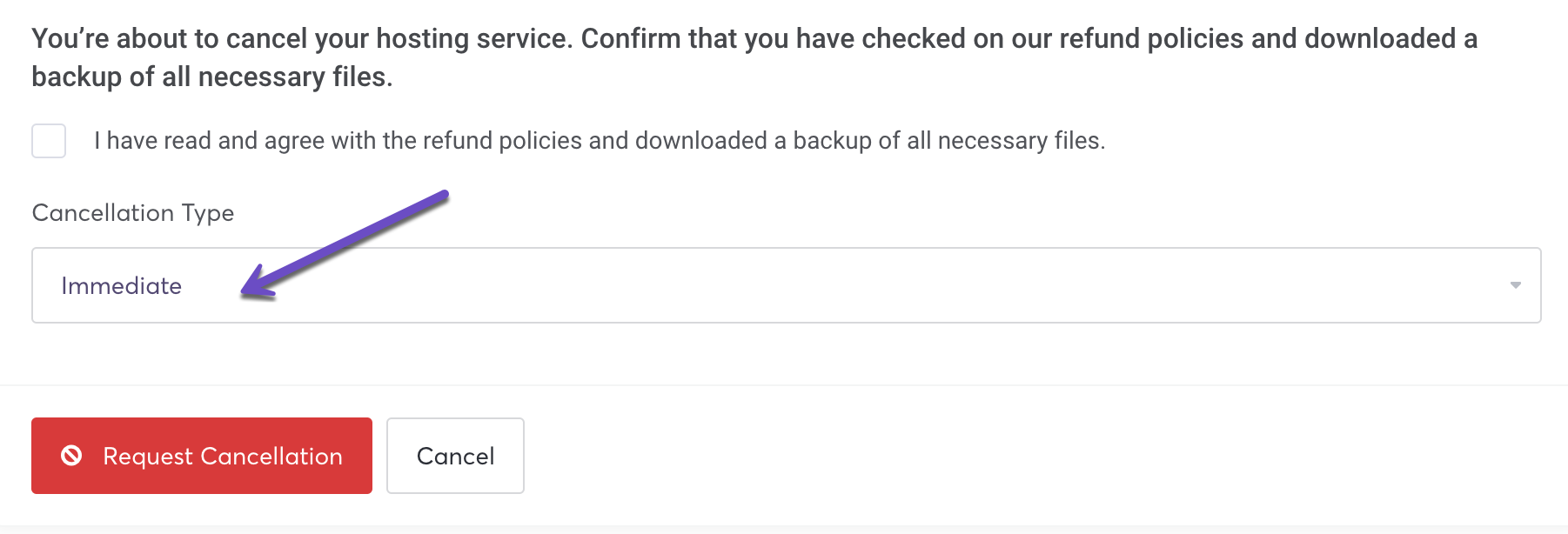 - Immediate: your hosting service will be automatically canceled when the daily system cron runs (9 AM EST).