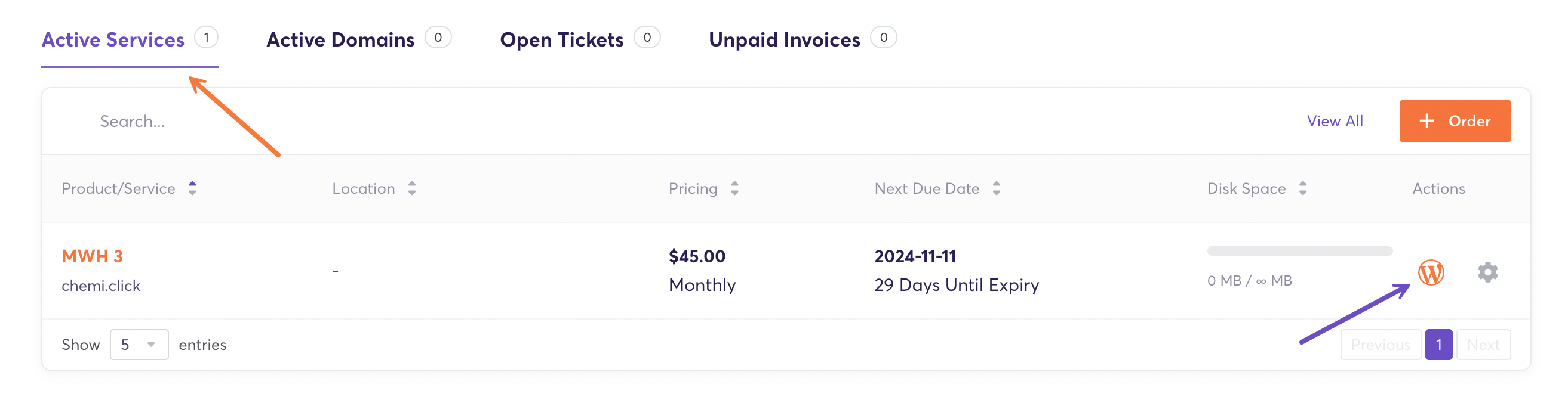Step 2: In your Client Area Dashboard, navigate to Active Services. Click the “WordPress Manager” icon on the right side.