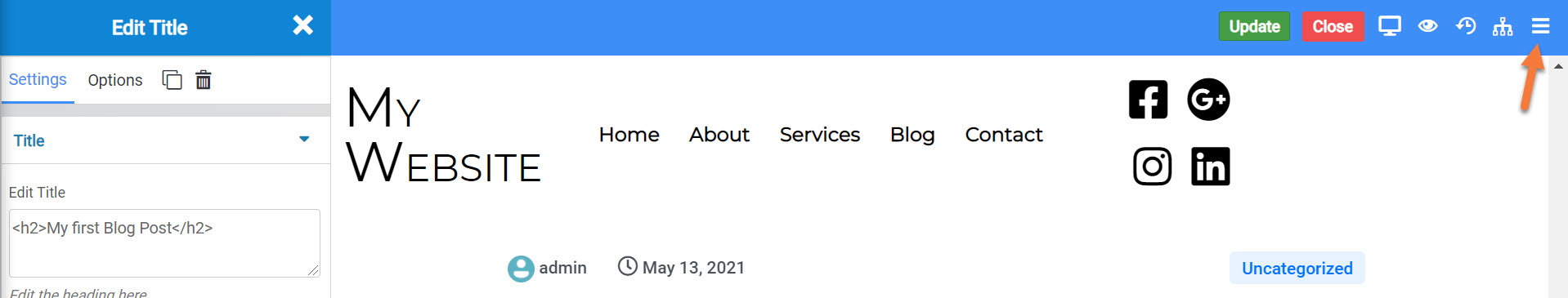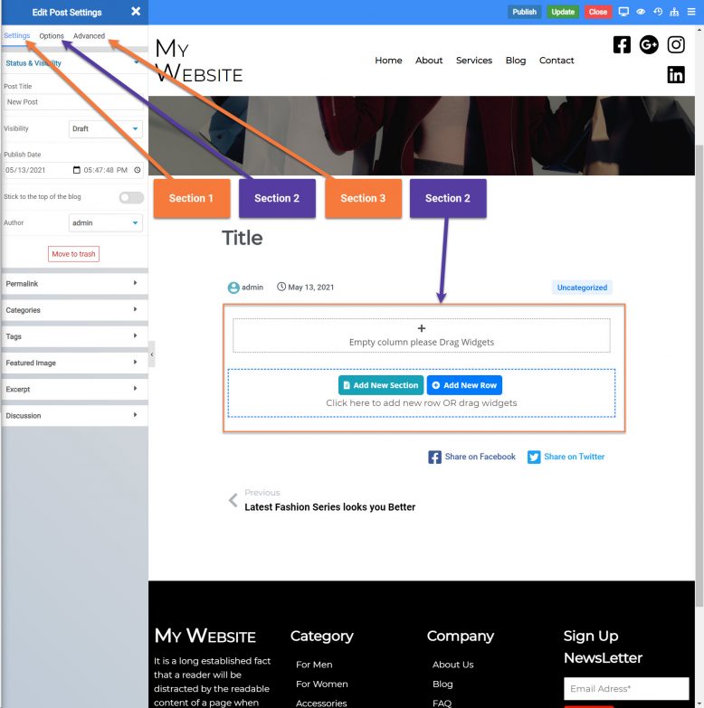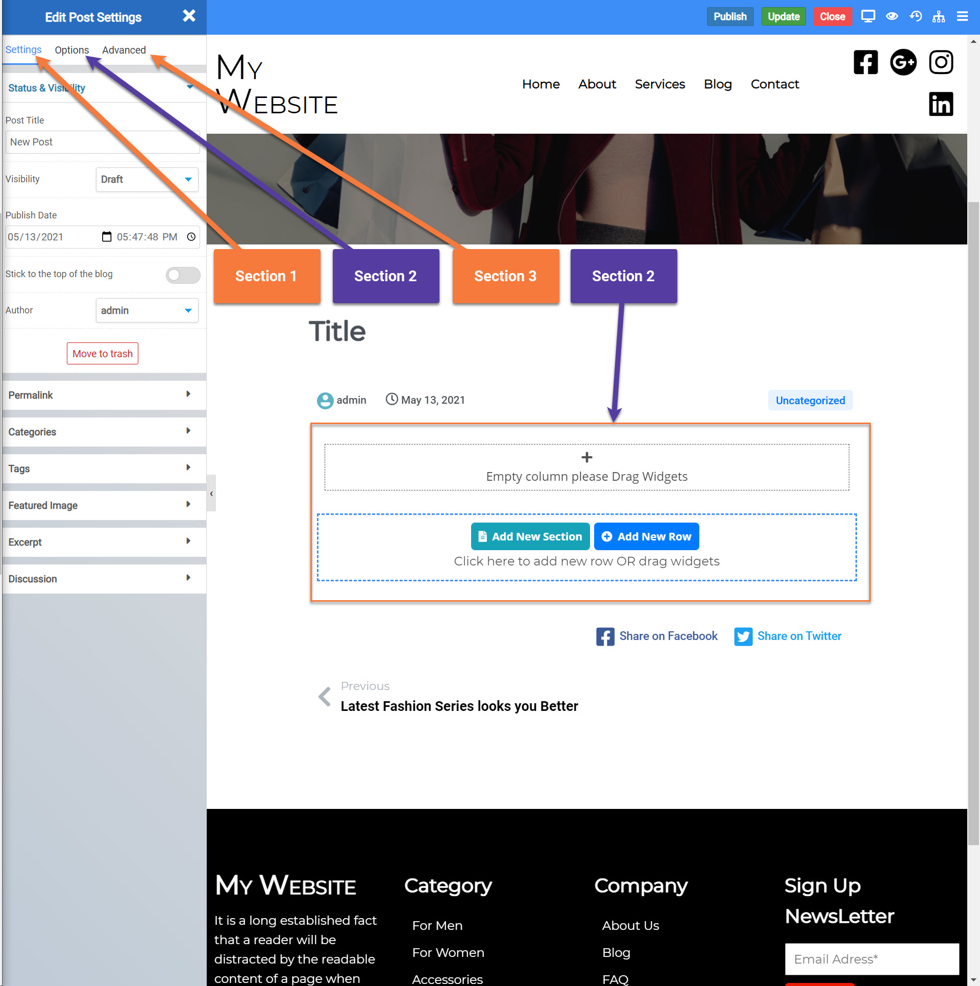If you didn’t notice yet, there’s no where to type your Blog out yet. That’s because you need to add it by adding widgets to the page. That’s why we saved this for the last section because you can’t see the widgets from this page view unless you click the “X” adjacent to the Edit Post Settings.