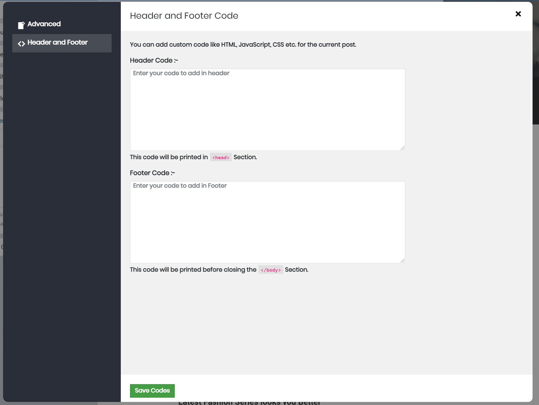 This section is super handy if you need to insert code in these specific sections of your page. Some reasons why you may do this: