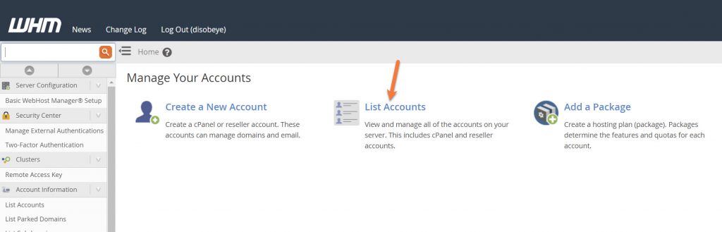 Step 2: Once you’ve logged in to WHM, click List Accounts.