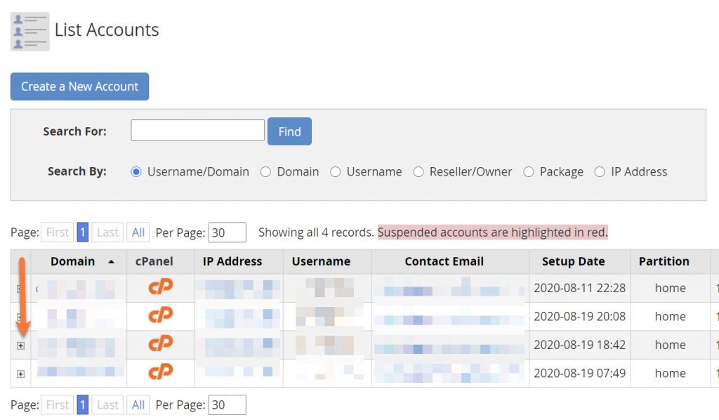 Step 3: In the accounts list, find the account or domain for which you would like to modify the bandwidth, then click the + to the left of the domain name to expand the administrative sections area.