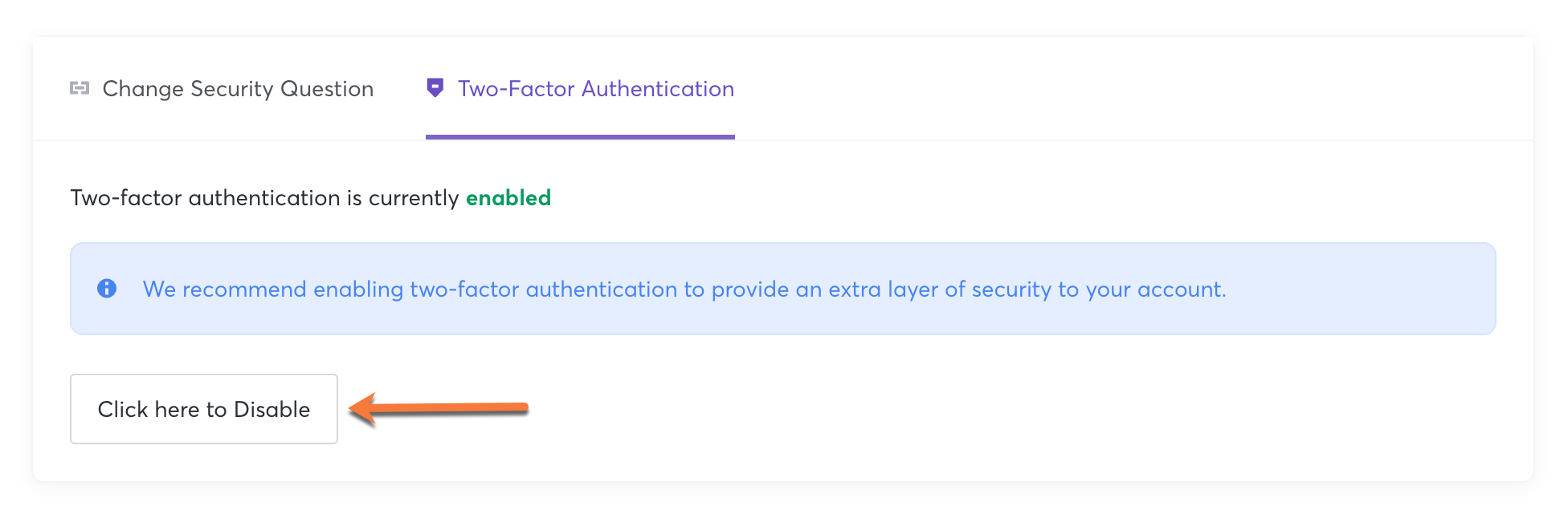 If you decide to disable two-factor authentication at a later date, you can simply click the Click here to disable button which will appear in the same location.