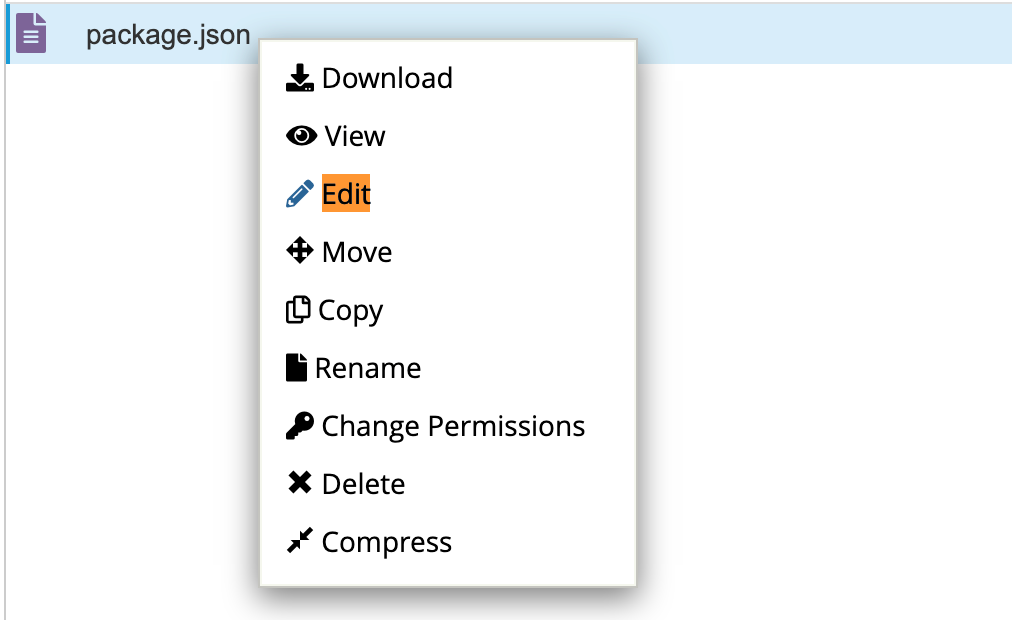 4) Once the file is created, Right-click or secondary click on the package.json file in the right-hand column of File Manager and then click Edit. An edit dialog box is displayed.