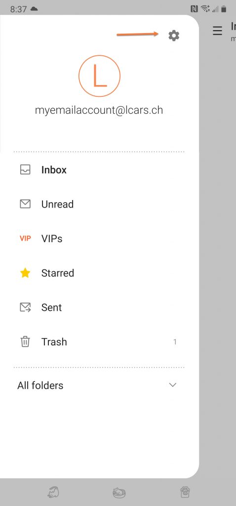 Step 1: Open the Samsung Email app and tap the ≡ icon (hamburger menu) in the top left corner, then tap the ⚙ cog to open Settings.