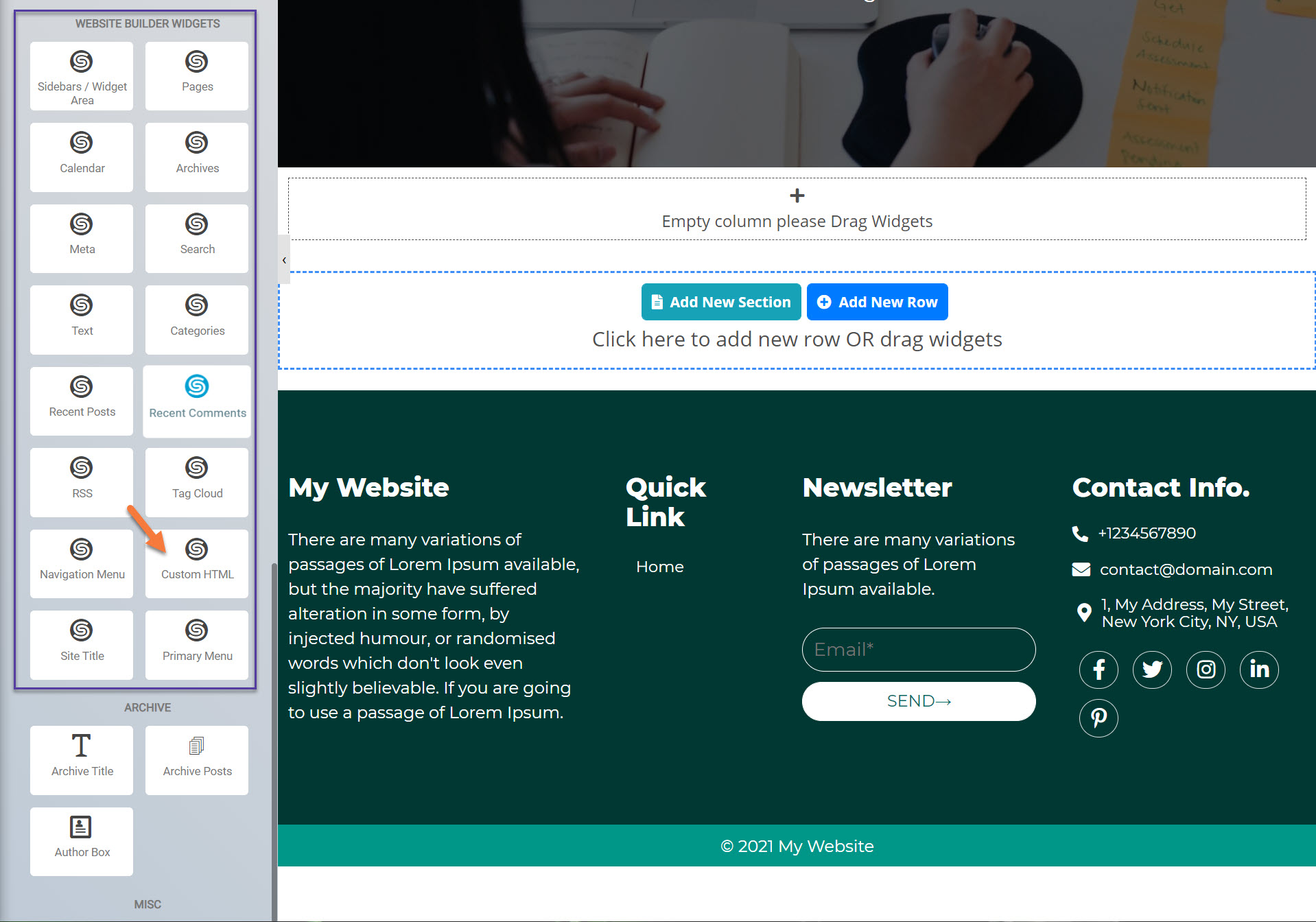 Look for the Custom HTML Widget, and drag it onto the page in the area which says “Empty column please Drag Widgets”.