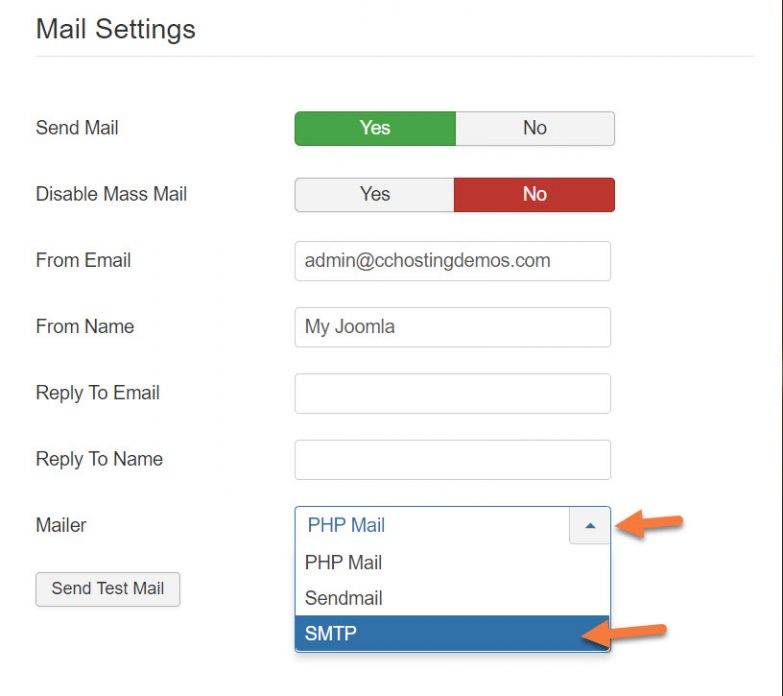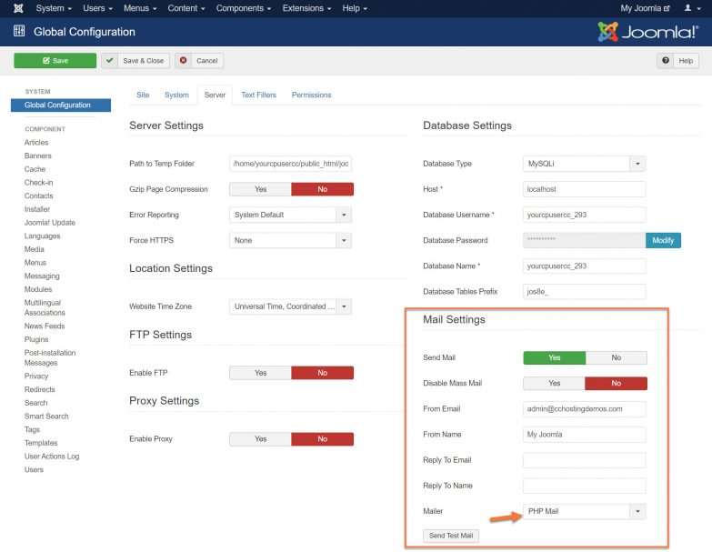 Once you have entered the account information, click Send Test Mail to test the configuration. Check the Inbox of the account you set up to send from and see if you see an email from your Joomla installation.