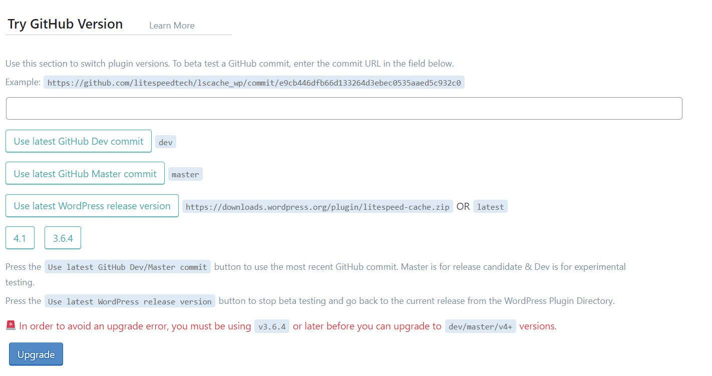 This is a really useful option if you want to test different versions of LSC (preferably on a staging site) and switch back and forth between BETA and STABLE versions. I imagine it could also be useful for rolling back to a previous version of the new ones are giving problems.