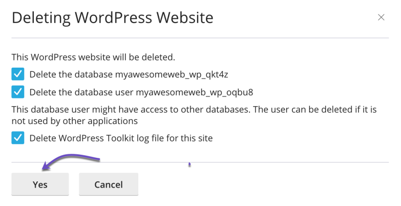 - Select the data you want to remove, and then click Yes. WordPress Toolkit will delete the data you specified.